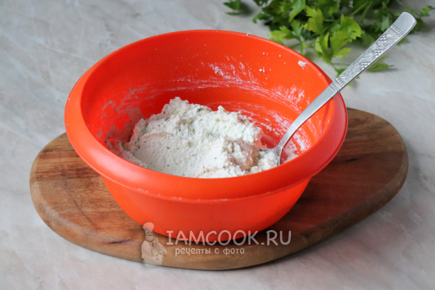 Творог переложите в глубокую миску, добавьте щепотку соли и мелко нарезанную зелень. Я использовала укроп, вы можете взять любую другую, которая вам нравится по вкусу и аромату. С помощью погружного блендера перетрите массу до однородного состояния.