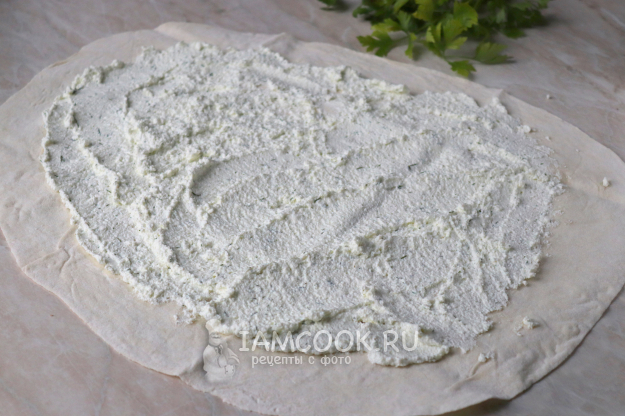 Разложите лаваш на плоской поверхности и щедро смажьте творожной начинкой, отступив немного от края (как показано на фото).