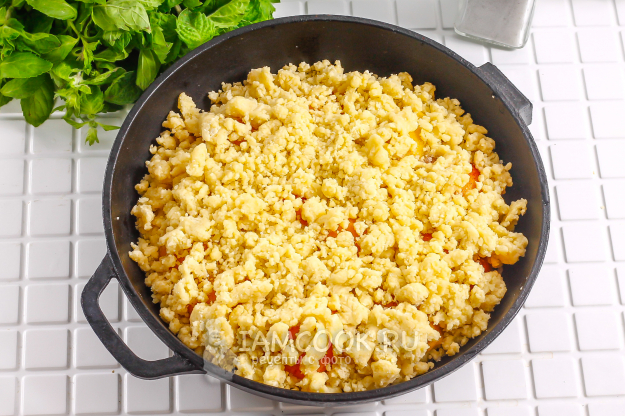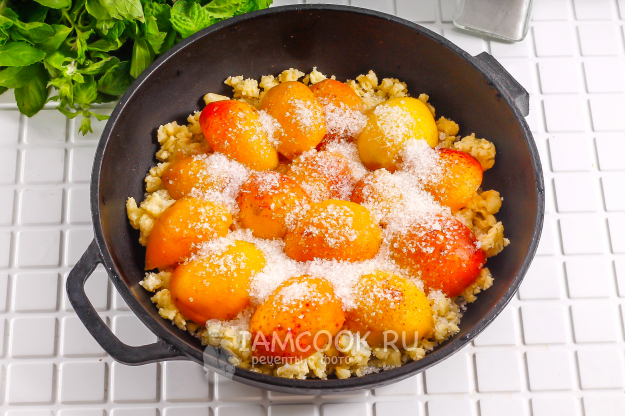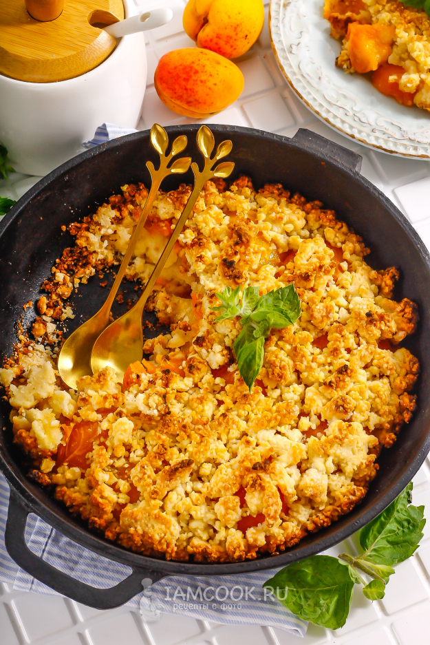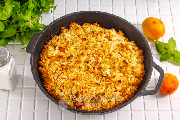 Всыпьте оставшуюся песочную крошку на фрукты и разровняйте. Поместите форму в духовку и готовьте тёртый пирог с абрикосами примерно 25-30 минут.
