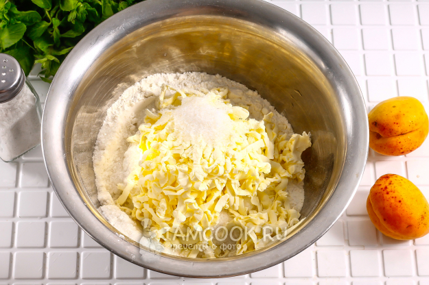 Всыпьте в глубокую емкость (миску или тарелку) пшеничную муку, просеяв ее. Добавьте туда же сахар, соль и разрыхлитель. Извлеките масло из морозилки и натрите его на терке с крупными ячейками прямо в муку.