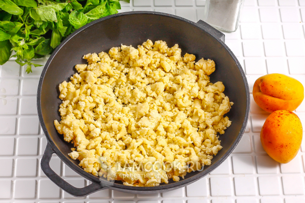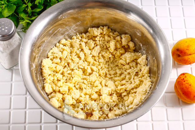 Тщательно вымешайте все содержимое емкости, чтобы у вас получилась крошка. Не добавляйте яйца, воду или другую жидкость! Вам потребуется именно песочная крошка. Поместите емкость в холодильник на 15 минут. В это время очистите абрикосы от косточек, разделите на две половинки и промойте в воде.
