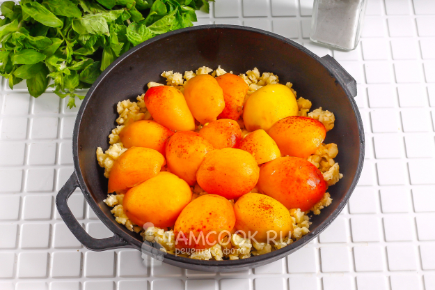 Половинки абрикосов выложите на песочную крошку. Если сорт абрикосов очень сочный, то сначала присыпьте песочную крошку крахмалом: кукурузным или картофельным, а потом выложите фрукты. При запекании они выделят сок и его впитает крахмал, а не тесто. Иначе тесто снизу останется полусырым.