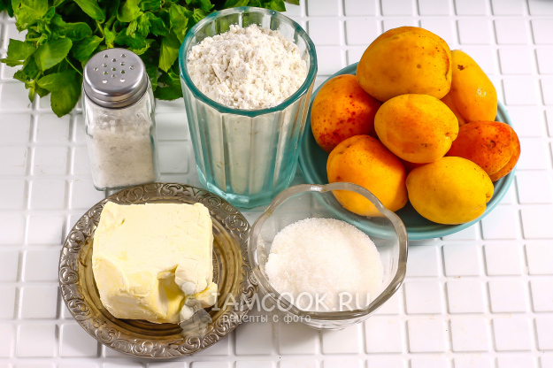 Возьмите необходимые ингредиенты для приготовления румяного тёртого пирога с абрикосами. Поместите сливочное масло в морозильную камеру на 10 минут. Можно заменить масло качественным маргарином.