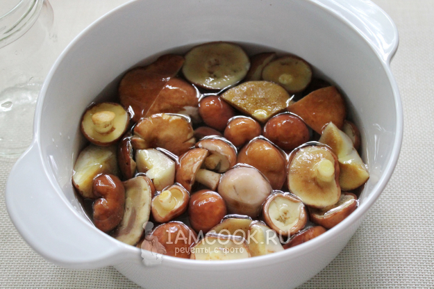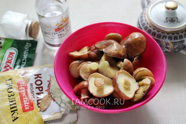 Возьмите продукты для заготовки маринованных маслят на зиму горячим способом.