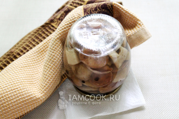 Горячими выкладываю маслята вместе с маринадом в банку и закрываю стерильной крышкой. Маринада должно быть не менее 30% объема.