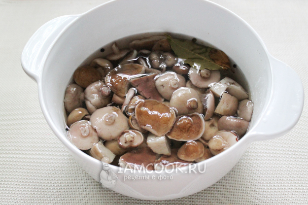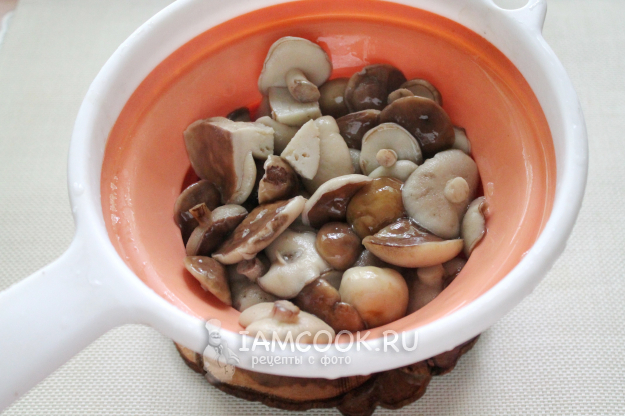 Сначала грибочки перебираем, очищаем от лесного мусора, заливаем водой и отвариваем в течение 10-15 минут в подсоленной воде (1 ст.л. на 1 литр). Затем эту воду сливаю, грибы промываю под краном, снова наливаю чистой воды и повторяю процесс.