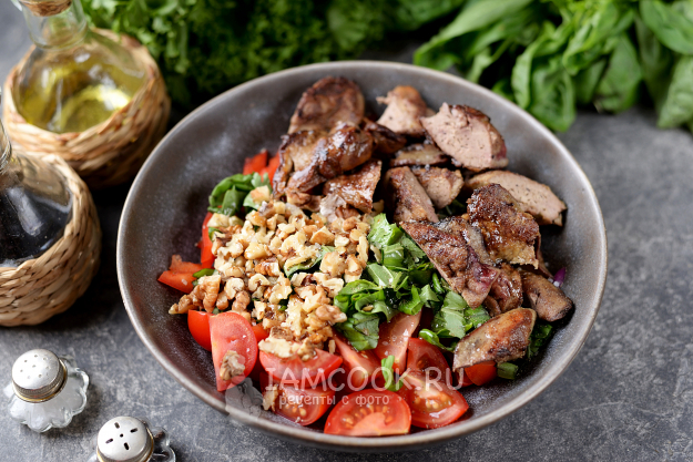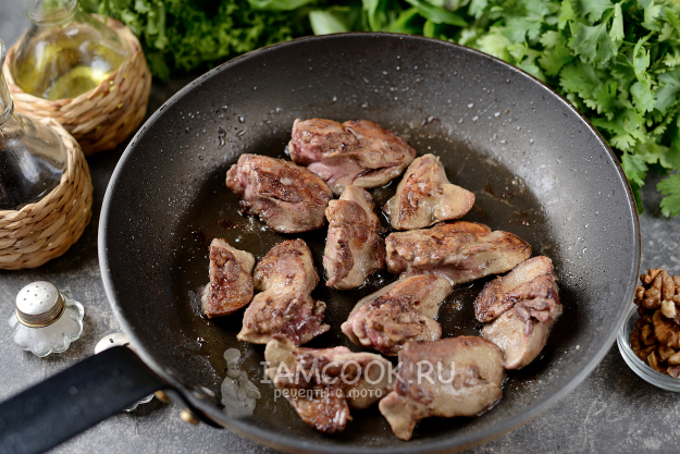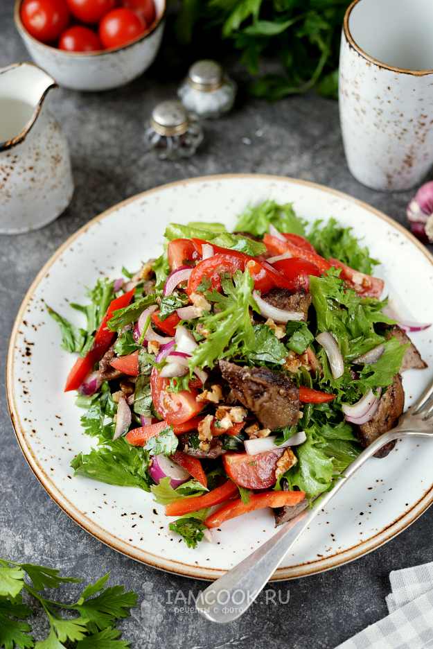 Вкусный, сытный и ароматный салат с куриной печенью по-грузински готов. Выложите на большое блюдо горкой и подавайте домашним на обед или ужин.