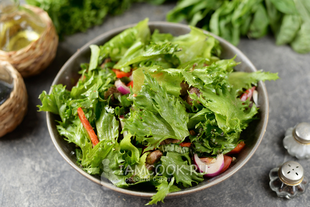Порвите латук руками, добавьте в миску последним. Салат посолите и поперчите, заправьте оливковым маслом, сбрызните винным уксусом, перемешайте аккуратно. При желании можно добавить острый перчик по вкусу.