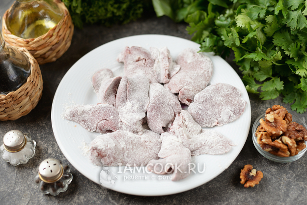 Куриную печень разрежьте пополам, удалите пленки и жир, посолите и поперчите по вкусу, запанируйте в муке. Если есть в наличии сванская соль - используйте ее.