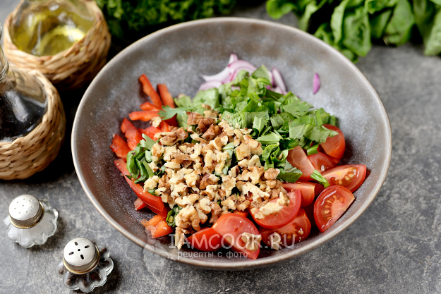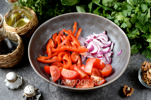А пока почистите перец от семечек, нарежьте его соломкой, добавьте нарезанные помидоры и сладкий лук. Я использовала ялтинский сорт. Зимой перец редко можно встретить в этом салате, но тогда появляются зерна граната.