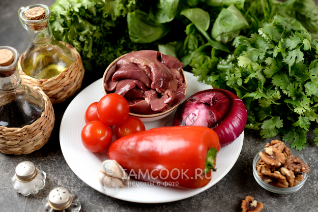 Возьмите все продукты для грузинского салата с куриной печенью и помидором. Овощи и зелень помойте и обсушите.