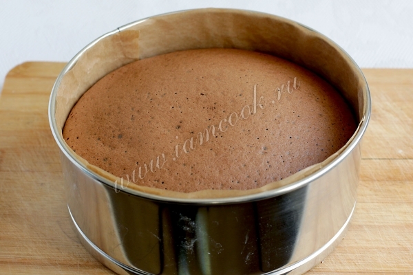 Готовый бисквит может немного осесть. Для этого лучше охлаждать его в перевернутом виде, на стаканах. Остывший бисквит вытащить из формы и освободить от пергамента.