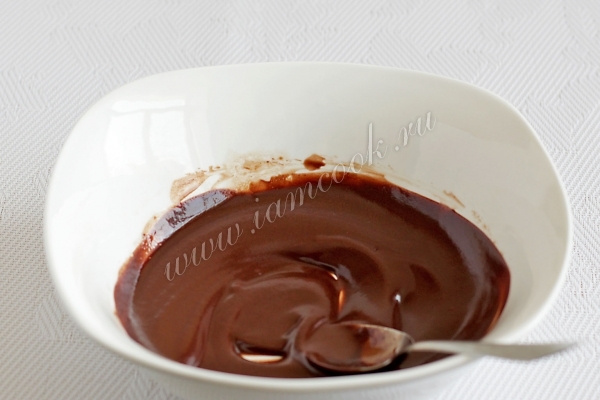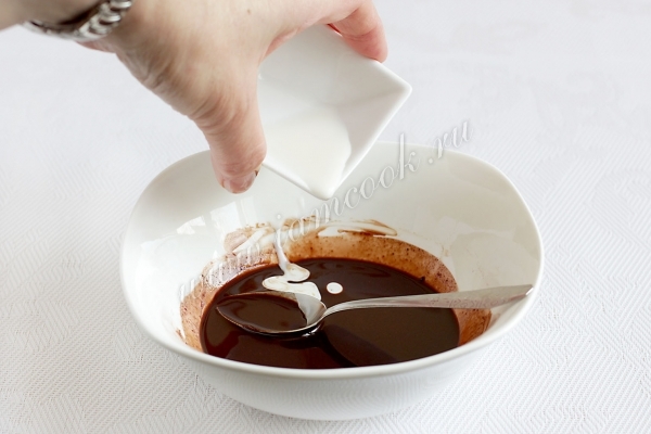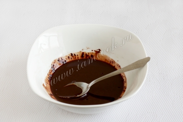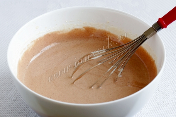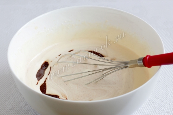 В два приема добавить во взбитые яйца шоколадную смесь и хорошо смешать венчиком вручную, размешивать только в одну сторону.