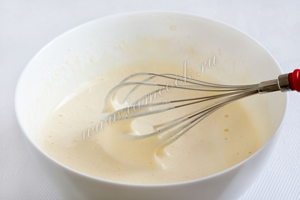 Затем в смесь влить молоко и снова хорошо размешать. Смесь загустеет на глазах.