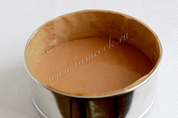 Тесто вылить в форму, предварительно выложив ее дно и стенки пергаментом. Выпекать при 170 градусах на нижней полке, затем еще 5-7 минут на средней . Я выпекала все время, 27 минут, на второй полке снизу. Нужно хорошо знать свою духовку. Лучинка должна оставаться сухой, а при легком надавливании бисквит должен пружинить.