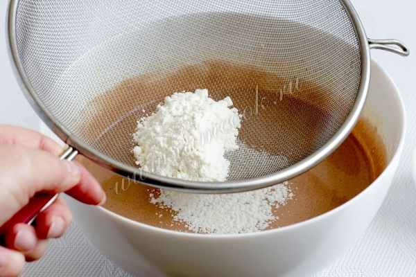 Муку с содой просеять и добавить в тесто в два приема. Смешивать ручным венчиком, как бы только скользя по поверхности.