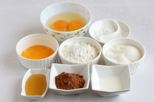 Ингредиенты: все составляющие лучше заранее взвесить и отмерить. Я использовала форму 18 см, но  по рецепту предусмотрен еще меньший объем. Так что, для большего размера бисквита нужно увеличить количество продуктов.