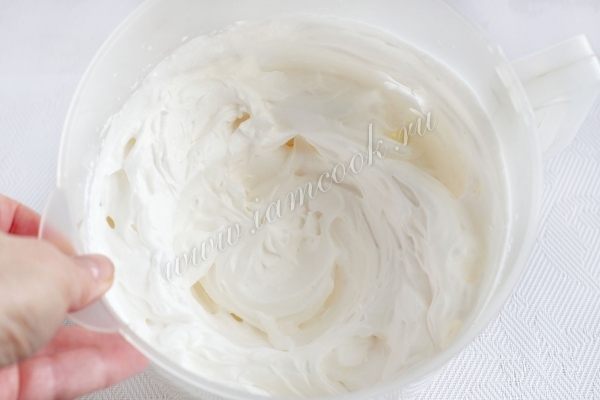 Смесь должна получиться белой и пышной, увеличиться в размере в несколько раз и оставлять следы от венчика. Теперь отложить миксер в сторону и ручным венчиком размешать массу по кругу, чтобы ушли крупные воздушные пузыри и смесь стала менее пенной. Пузыри - враг японского бисквита.