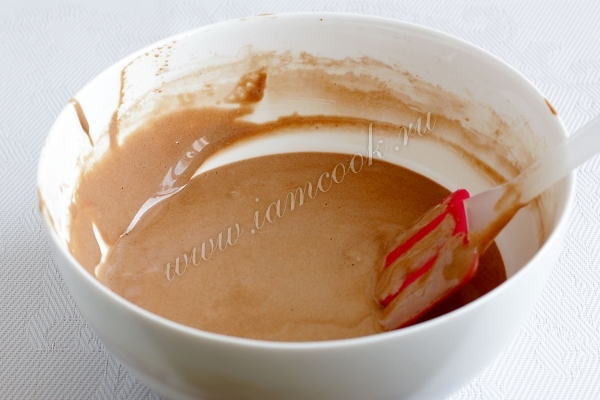 Вот такая смесь получается. Следите, чтобы не осталось не размешанного какао. Затем помочь себе лопаткой, переворачивая смесь снизу и снимая остатки по краю посуды.
