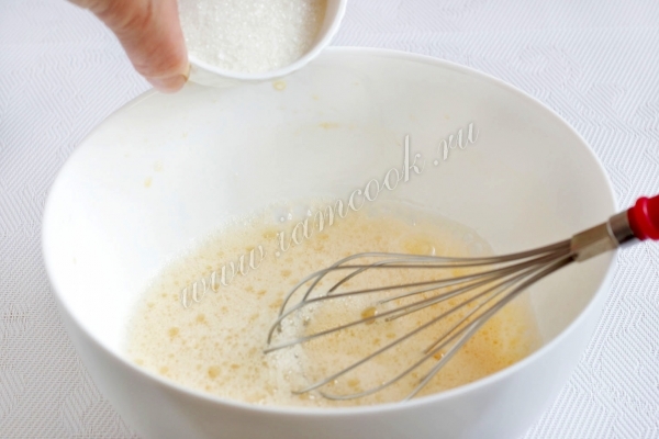 Затем взбивать обычным миксером до хорошей пены. Как только яйца начнут пениться, начать добавлять малыми порциями сахар и продолжать взбивать.