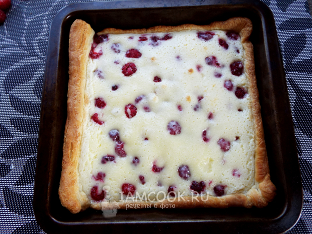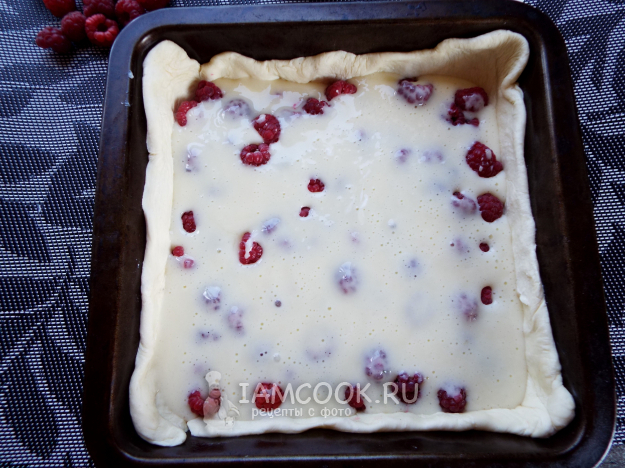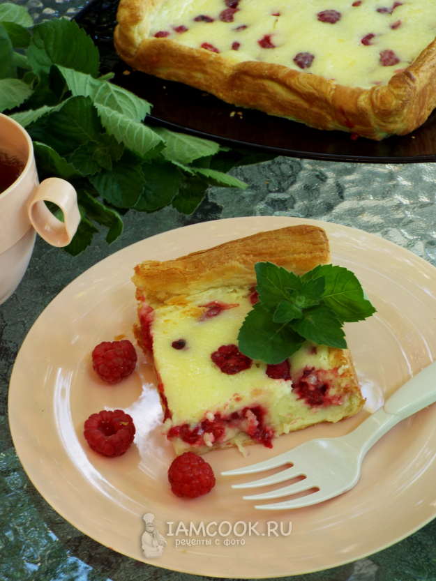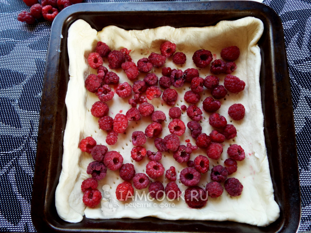 Пирог с малиной из слоеного дрожжевого теста готов.