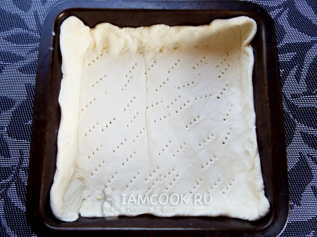 Тесто раскатать. Выложить в форму (22x22см), смазанную сливочным маслом, сделав бортики.
