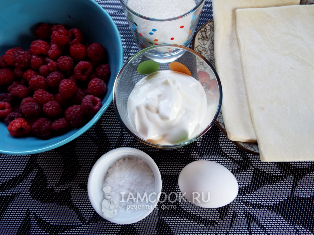 Подготовить продукты для пирога с малиной из слоеного дрожжевого теста по списку.