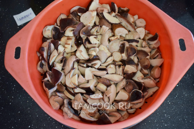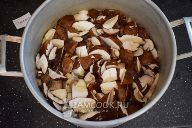 Подготовьте ингредиенты для щей с белыми грибами. Очистите грибы от загрязнений и нарежьте их крупными кусочками. Маленькие грибочки достаточно разрезать пополам. Помойте грибы в проточной воде. Затем выложите в кастрюлю, залейте водой и поставьте на огонь. Доведите до кипения и проварите минут 15-20. При закипании будет появляться пенка, которую необходимо убрать. С пенкой из грибов выходит лишняя грязь и имеющаяся живность, которую не обнаружили при сборе грибов и их чистке. Поэтому не стоит кидать в суп сразу сырые грибы. Лучше их немного обварить.