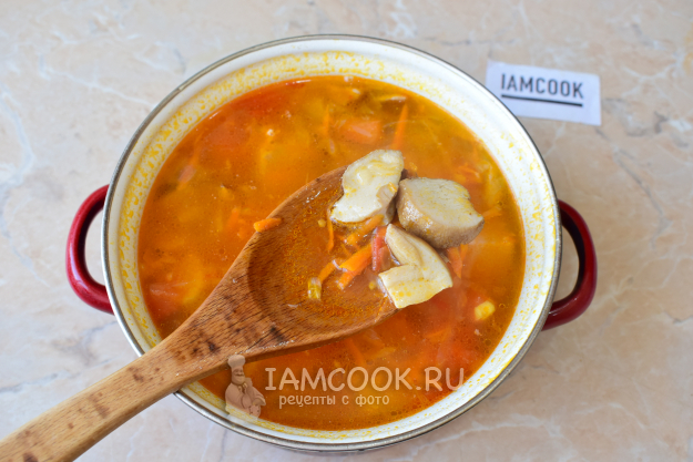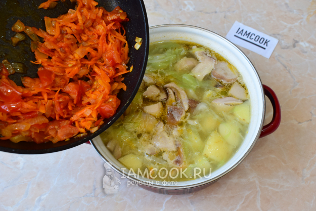 Обжаренные овощи выложите в кастрюлю с супом. По вкусу добавьте немного соли и специи.