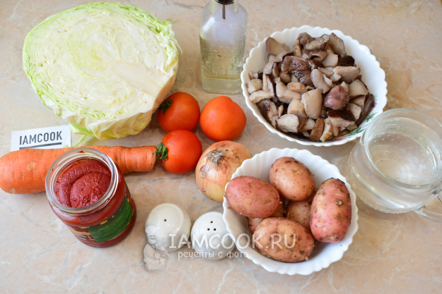 А теперь подготовьте все остальные ингредиенты. Количество картошки и капусты можно немного изменить по своему вкусу. Чтобы первое блюдо было наиболее сытным, готовьте на мясном бульоне. Постные щи - конечно же, на воде.