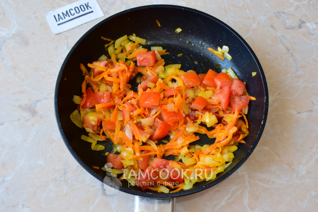 Помидоры нарежьте кубиками и добавьте к поджарке вместе с томатной пастой. Обжаривайте еще пару минут. Помидоры станут мягче и дадут сок.