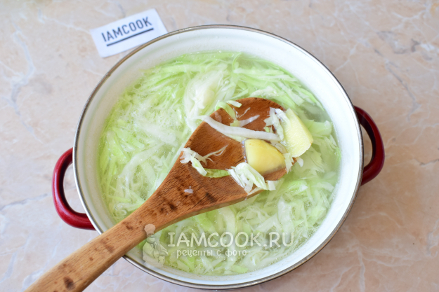 Бульон или воду налейте в кастрюлю и доведите до кипения. Капусту и картофель нарежьте и опустите в бульон.