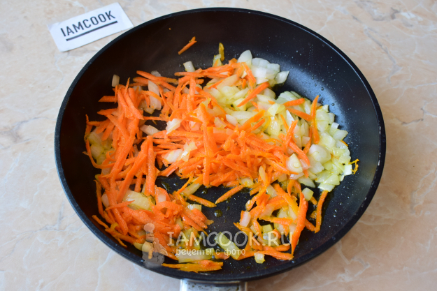 В это время подготовьте поджарку. Лук и морковь очистите, измельчите, и обжарьте овощи 2-3 минуты с добавлением небольшого количества растительного масла.