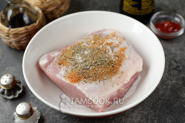 Переложите свинину в глубокую миску, всыпьте все приправы, соль и перец по вкусу.