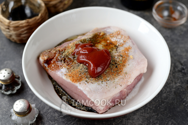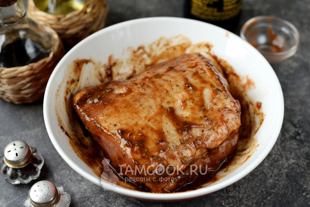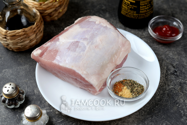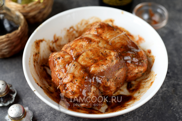 Натрите мясо этой смесью тщательно со всех сторон, отставьте в сторону на какое-то время мариноваться. Будет замечательно, если время от времени вы перевернете корейку несколько раз.