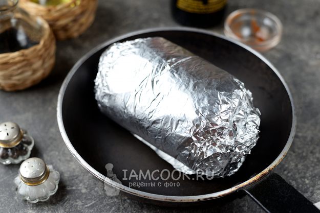 Плотно замотайте мясо в несколько слоев фольги, переложите в удобную форму для запекания и отправьте в предварительно разогретую до 180 градусов духовку на 1 час или чуть дольше, в режиме верхнего и нижнего нагрева, зависит от толщины куска в диаметре. Этот я держала в духовке 1 час 20 минут. При необходимости подливайте в противень воду. Спустя время можно разрезать фольгу и поставить корейку под верхний гриль еще минут на 20, чтобы зарумянилась.