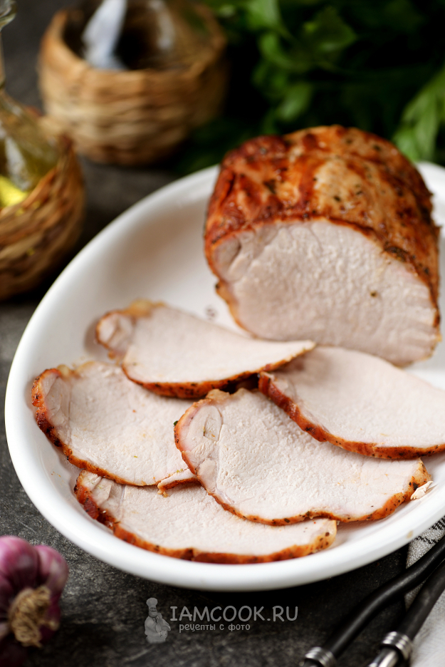 Снимите со свинины фольгу, срежьте и удалите нитки, а мясо нарежьте тоненькими ломтиками и можно подавать к столу. Это отличный вариант горячего, которое можно подать семье на обед или на праздничный стол поставить, также это классная закуска, которая одинаково вкусная как в горячем, так и в холодном виде.