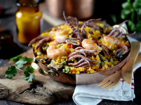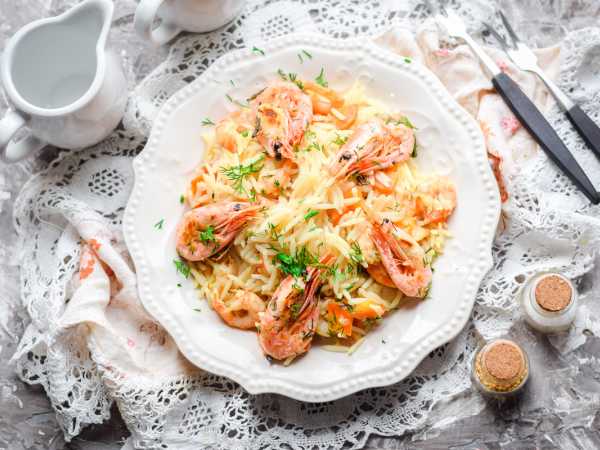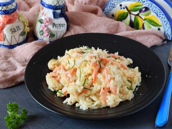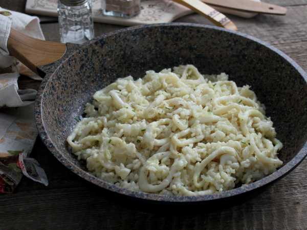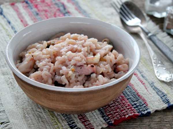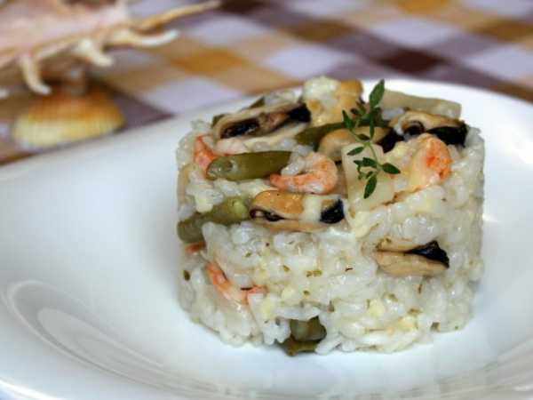 Очистите креветок от панциря и кишечника. Если будете использовать крупные хвосты, тогда нарежьте их небольшими кусочками и переложите в сковороду. Теперь ризотто можно посолить и поперчить, аккуратно перемешать и оставить еще минуты на 2, чтобы креветки приготовились.