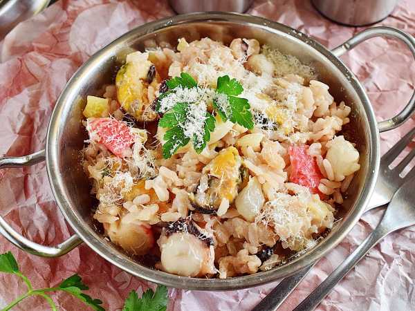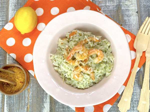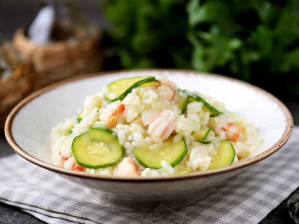 Невероятно вкусное ризотто с цукини и креветками готово. Разложите по тарелкам и сразу же подавайте к столу.