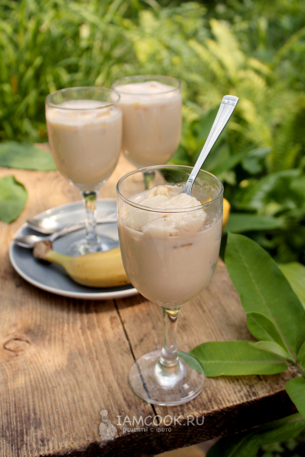 Банановая панна-котта (панакота) через час охлаждения в холодильнике полностью схватывается и готова к подаче.