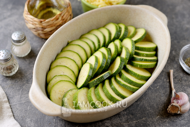 Нарежьте кабачки кружочками толщиной 0,3-0,5 миллиметра, выложите в противень для запекания, как показано на фото, слегка посолите и поперчите их.