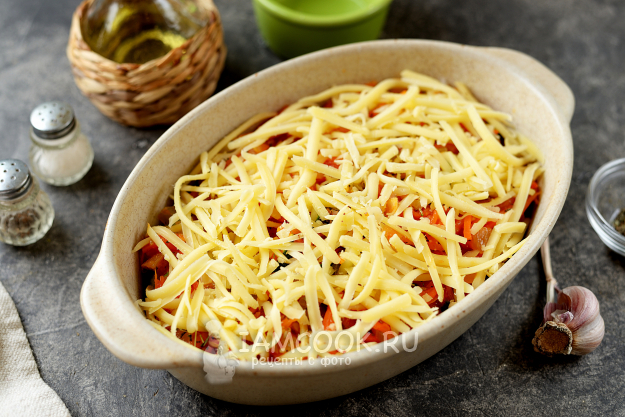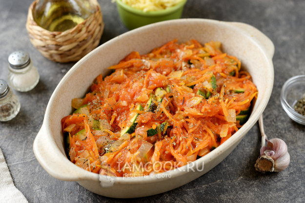 Щедро посыпьте кабачки с овощной подливой натертым твердым сыром и отправьте в предварительно разогретую до 180 градусов духовку на 30-35 минут в режиме верхнего и нижнего нагрева.
