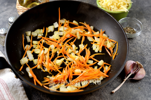 Разогрейте в сковороде растительное масло, обжарьте на нем нарезанный репчатый лук и натертую морковь.