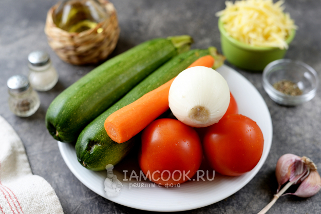 Возьмите все продукты для приготовления кабачков под шубой в духовке. Лук и морковь почистите, помойте все овощи под проточной водой и обсушите, натрите сыр на крупной терке.