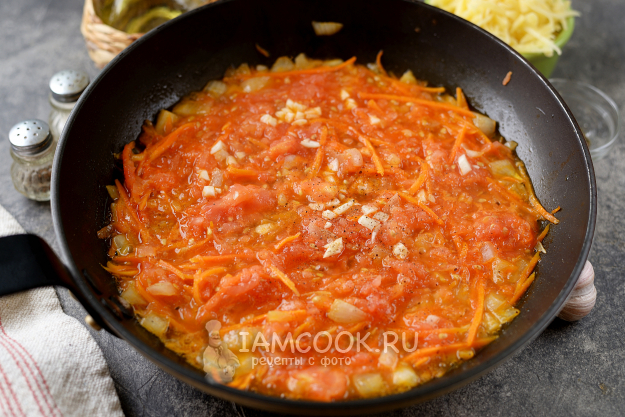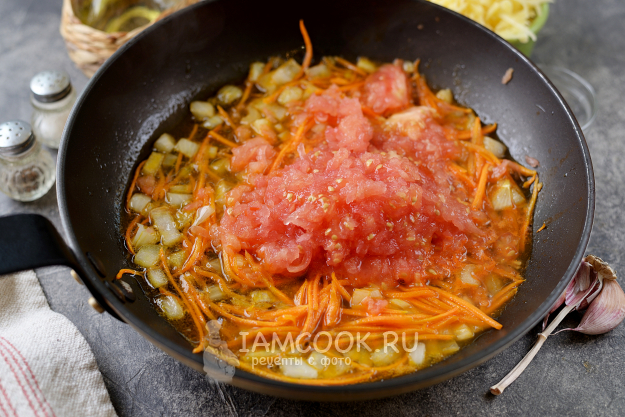 Когда лук с морковью станут мягкими и прозрачными, добавьте натертые на терке помидоры. Тушите минут 5.