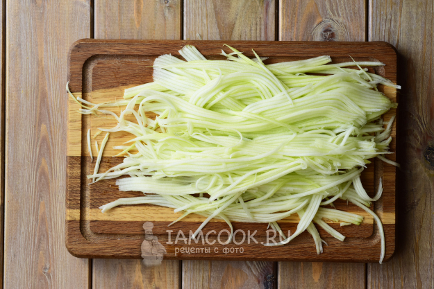 С помощью овощечистки или специальной терки нарежем или натрем кабачок в виде длинной тонкой лапши.