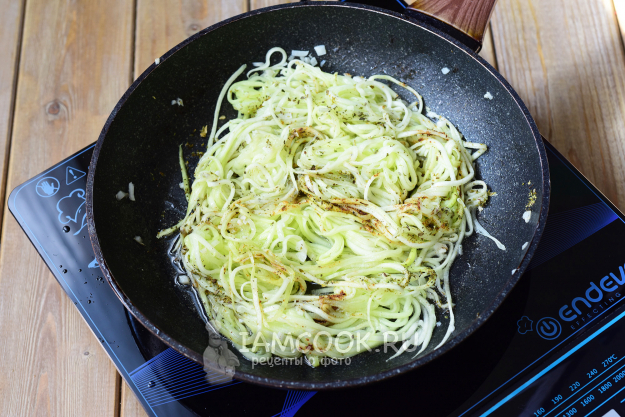 Затем выложим кабачковую пасту и будем, помешивая лопаткой, обжаривать 3-4 минуты.