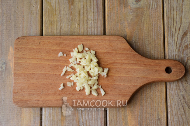 В сковороде на среднем огне разогреем растительное масло и выложим измельченный чеснок. Будем обжаривать чеснок примерно 2 минуты, постоянно помешивая.