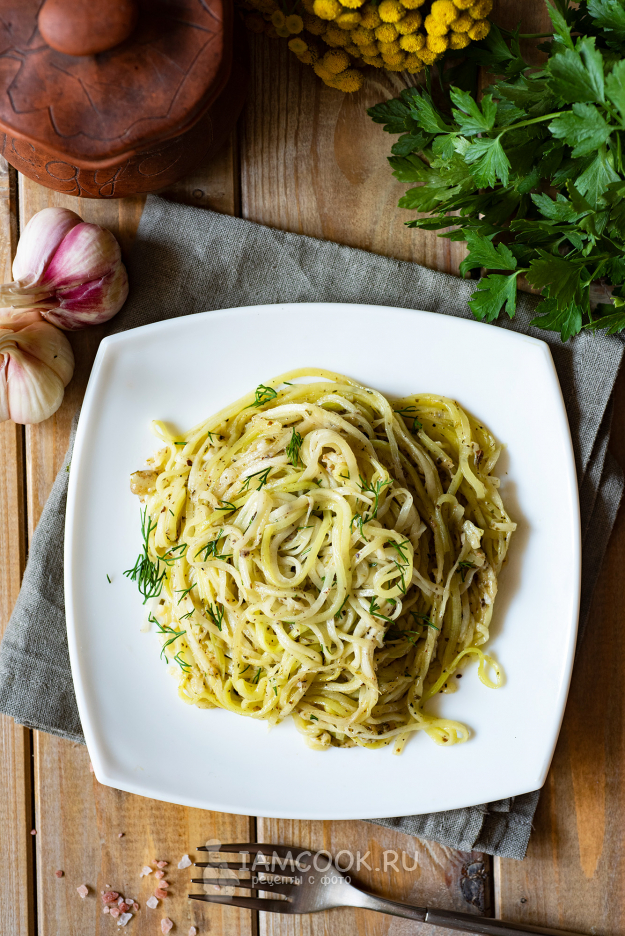 Предлагаю приготовить очень интересное вегетарианское блюдо из кабачков. Визуально оно похоже на настоящую пасту, но на самом деле, кабачки нарезаются в виде длинной лапши, обжариваются с чесноком и специями, в конце добавляется сыр, и в итоге овощная паста невероятно аппетитно выглядит и имеет достойные вкусовые качества. Такая паста идеально разнообразит диетического меню и украсит собой вегетарианский рацион. Набор специй вы можете подобрать по своему вкусу, а растительное масло можно заменить на сливочное.