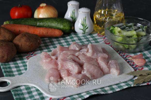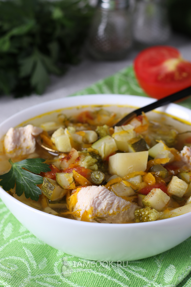 Для приготовления супа из индейки с овощами подготовить из списка необходимые ингредиенты.
